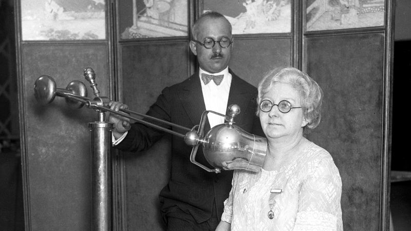 Dr. Herman Rubin uses the Endocrinator to administer a radium treatment on Frances Martell at a beauty show in the 1920s. Rubin claimed the device would “make old men feel young again and young men feel younger.” (Chicago Herald and Examiner)