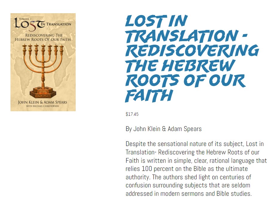 The book that started it all. I was teaching in the public school in 2014 when an fellow teacher told me he had left church and had starting following Torah. I was intrigued and asked him to tell me more. He let me borrow a copy of his Lost in Translation book by John Klein, Adam Spears, and Michael Christopher. I was blown away and the rest is history….